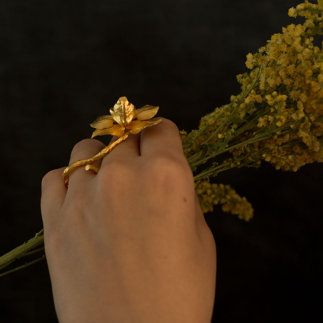 Nuestro Anillo Ramita Orquídea Phalaenopsis Baby Large es una fusión artística de lo exótico y lo cotidiano. Recolectamos con cariño las flores de orquídea Phalaenopsis baby de nuestro jardín y las ramitas de palma de coco en nuestras caminatas, para crear una pieza única de bronce bañada en oro de 24k. Este anillo es una elección ideal para quienes buscan llevar la delicadeza de la naturaleza y un diseño que cuenta historias.